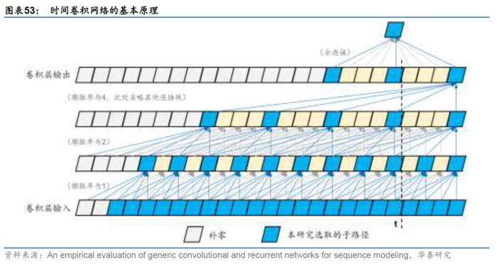 在使用卷积神经网络提取时间序列特征时,通常需要保证每一步骤的时序因果关系不能颠倒,即t时刻提取的特征仅由t时刻及更早的输入序列合成。对此,Bai et al. (2018)提出了时间卷积网络(Temporal Convolutional Network, TCN),其通过膨胀率成倍增加的膨胀卷积核,来保证时序因果关系,如图表53所示。本研究在构建条件生成器和条件判别器时,都借鉴了TCN的思想。不过,为了快速实现时间序列的降维,本研究仅选取图表53的蓝色路径,作为用来提取序列特征的组件。不难证明,蓝色路径可以通过直接对原始序列进行大小为5、步长为2的卷积操作近似实现。