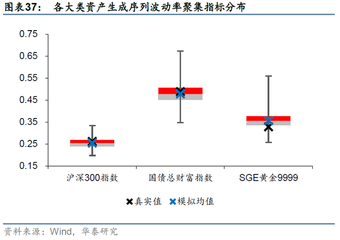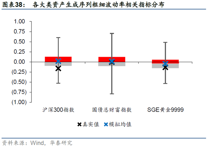 平均波动率指标的对比如图表34和图表36所示。结果显示,尽管真实序列的评价指标在生成序列评价指标的取值范围之内,但均低于模拟均值,表明cGAN容易系统性地高估资产收益的长期平均波动水平。这可能是因为生成序列中更容易出现持续快速上涨和持续快速下跌等极端情况,放大了收益率序列的波动。不过,cGAN正确地复现了三种资产平均波动率的相对大小:沪深300指数>SGE黄金9999>中债-国债总财富指数。