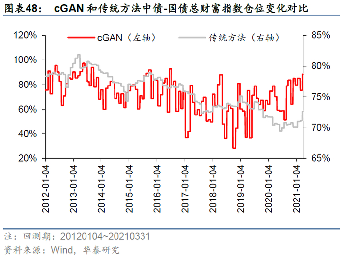 正因为如此,cGAN能够更敏锐地捕捉到市场的变化,对资产风险作出更合理的评估。图表47、图表49和图表51分别展示了三种资产cGAN相对于传统方法的超配比例与资产价格走势的对比。在2016年下半年至2017年底、2020年5月底至8月底的两轮单边牛市行情中,cGAN均判断权益资产的风险较低,及时加仓沪深300指数,从而在牛市中获得更高收益。而在整个2015年以及2020年下半年至2021年3月底区间内,cGAN均判断权益资产的风险较高,减仓沪深300指数,尽管放弃了前半程冲顶行情下的部分收益,但成功规避了后半程的急跌行情,控制了策略的最大回撤。