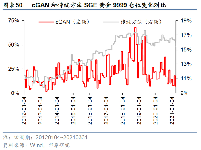 图表46、图表48和图表50分别展示了cGAN和传统方法计算得到的三种资产的仓位变化对比。结果显示,cGAN与传统方法下仓位变化的趋势较为一致,表明cGAN与传统方法对于每种资产加仓或减仓方向的长期趋势判断一致。这可能是因为cGAN和传统方法在判断加仓或减仓方向时,利用的都是相邻两个滚动窗口交错部分(即上一个滚动窗口最早20个交易日与当前滚动窗口最近20个交易日)的信息差,如图表45所示。