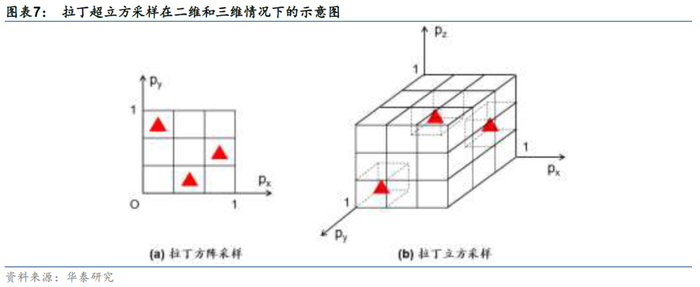 对此,本文使用一种更高效的随机采样方法——拉丁超立方采样来估计资产协方差矩阵。与网格采样相同的是,拉丁超立方采样同样需要对概率空间的每一维度进行s等分;与网格采样不同的是,拉丁超立方采样并不对每个超立方体都进行蒙特卡洛采样,而是只对其中s个超立方体进行采样,且采样的结果需满足类似“数独”的规则,即正交于任何轴的任一超平面最多只有一个样本,从而将采样复杂度从O(s^d)降低至O(s)。