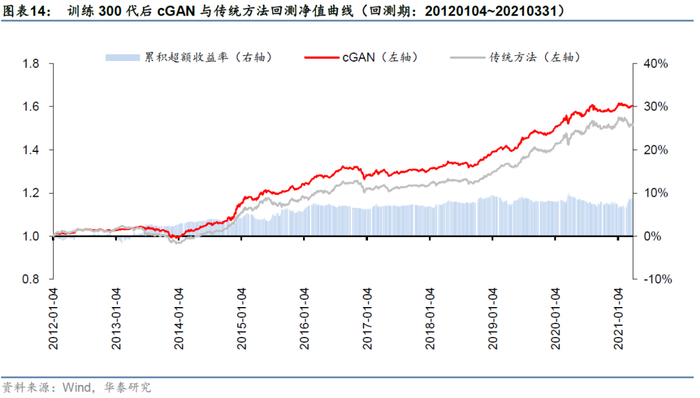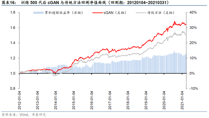 在接下来的研究中,我们将以训练600代后的cGAN(后文简称“基础cGAN模型”)为例,考察更多其他因素对回测表现的影响。
