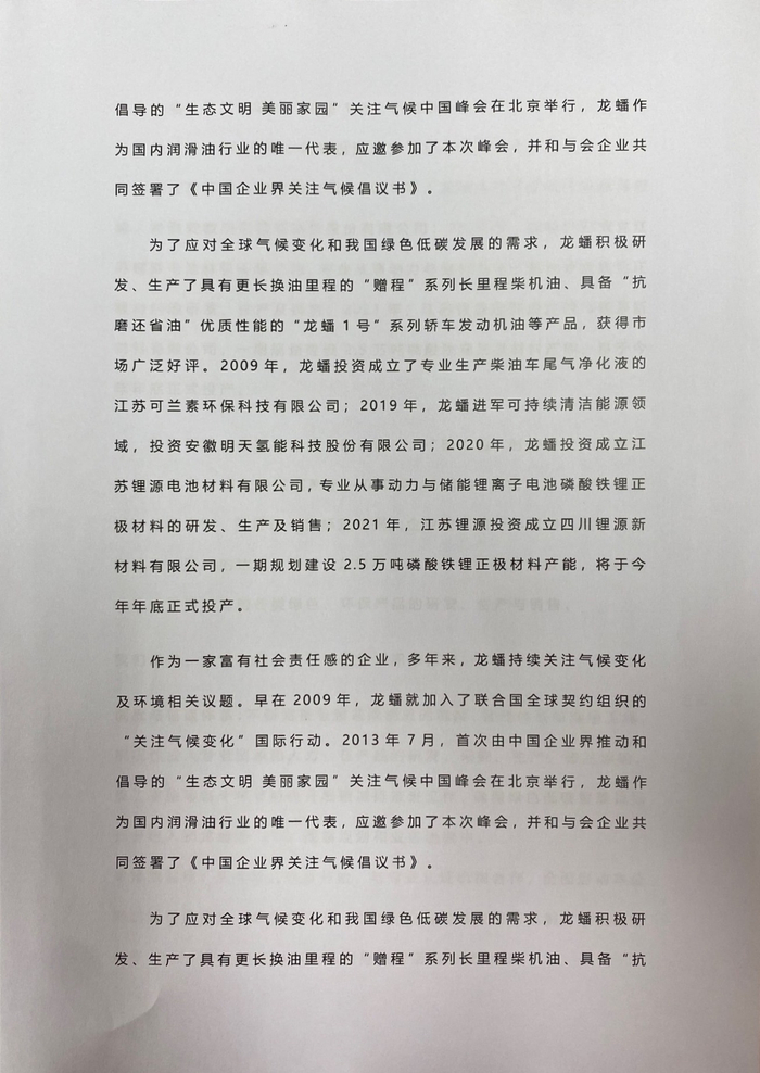 在这份战略声明中,首先介绍了即将于本月22日开幕的全球领导人气候峰会等背景,随后回顾了龙蟠科技自2008年以来,在积极履行企业社会责任、关注全球气候变化等层面所采取的一系列行动,以及为满足汽车化学品、润滑油行业绿色低碳发展的需求,在产品研发、产业投资等领域内所开展的各项努力。
