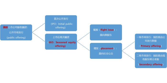 另外,特别注意的是,美股上市公司股权融资分为两种:其一是首次公开发行,也就是IPO;其二是上市后再次融资,英文全称为seasoned equity offering,简称SEO。而SEO(seasoned equity offering),不等于secondary offering,两者很容易被混用。