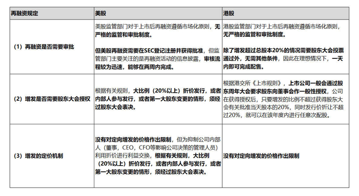 区别在于,美股再融资需要在SEC登记注册并获得批准,但监管部门主要关注的是再融资活动的信息披露,审核流程较为迅速,能够在两周内完成。而港股方面,除了增发超过总股本20%的情况需要股东大会投票通过外,无需其他条件,因此在理想情况下,一天内即可完成配售。