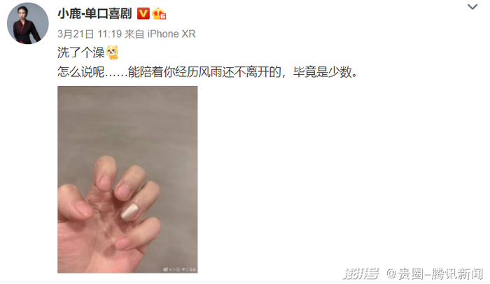 小鹿曾发微博吐槽,自己洗完澡,做的指甲只剩了一个