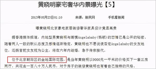 据悉,“朝阳区建国路91号院”就是著名的金地国际(又名金地花园),黄晓明在这里有一套房子,早在黄晓明与Baby大婚时就有媒体报道这是黄晓明和Baby的婚房。据当年媒体报道,黄晓明是以9000元的单价买下的,共花去180万。