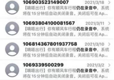 三月起,闻女士使用“嘀嗒出行”网约车平台的顺风车功能,行程结束后她多次收到短信提示“你有顺风车行程仍在录音中,系统将在15分钟后自动关闭录音”。