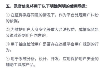 嘀嗒公司《录音信息收集协议》中提到,录音信息将用于以下明确列明的使用场景中:采集的录音用于系统分析,设计、开发、应用保护用户安全的辅助工具或产品。
