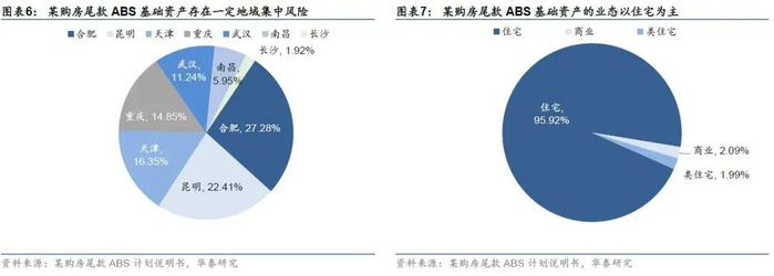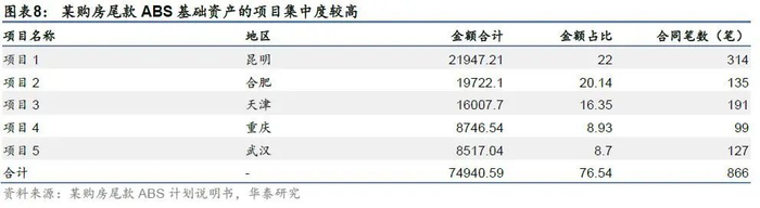 以某购房尾款ABS为例,进行现金流分散度分析。从入池资产笔数来看,该购房尾款ABS的初始基础资产池中共涉及1,281笔购房合同,资产笔数适中,有利于现金流的分散。从资产关联度来看,该购房尾款ABS的初始基础资产主要分布在合肥市、昆明市和天津市,应收购房尾款金额合计占比66.04%,存在一定的地域集中风险;初始基础资产涉及房地产项目数量12个,其中前五大房地产项目应收购房尾款金额合计占比76.54%,单一项目的应收购房尾款金额最大占比为22%,存在一定项目集中风险。从最终风险来源来看,该购房尾款ABS的房屋业态以住宅为主,占比为95.92%,现金还款来源为分散的个体,集中违约的风险较低。