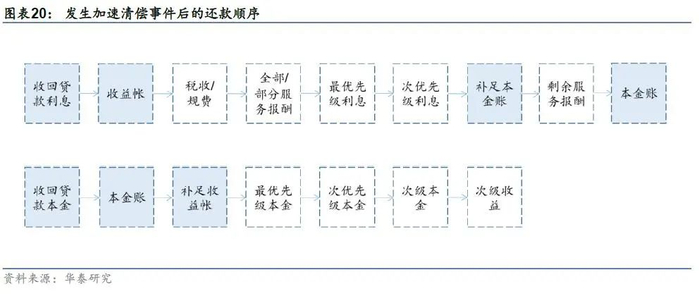 加速清偿事件通常与主体履约能力和资产池表现相关。加速清偿事件主要由两类情况引起,一是主体履约能力出现问题,如原始权益人丧失清偿能力、发起机构或资产服务机构主体评级降低、资产服务机构解任等,二是资产池表现不佳,如累计违约率上升等。在发生加速清偿事件后,现金流偿付顺序改变。如果产品设立了循环购买机制,在加速清偿事件发生后停止循环购买,直接进入摊还期;如果基础资产现金流首先由主体账户归集,则应加快归集频率,防止主体在归集期间出现资质问题造成资金无法流向专项计划账户。实操中,加速清偿对现金归集端效果有限,主要影响现金分配端。
