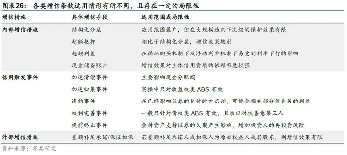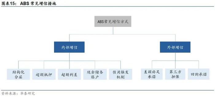 增信措施是降低ABS信用风险的重要手段。内部增信方式包括结构化分层增信、超额抵押、超额利差、现金储备账户、信用触发机制等,其中结构化分层和超额抵押通过划出资产池中部分资产来为ABS提供信用保护,信用触发机制通过设置特殊事件的触发条件保护投资者的利益;外部增信方式包括差额补足承诺、保证担保、回购承诺等。