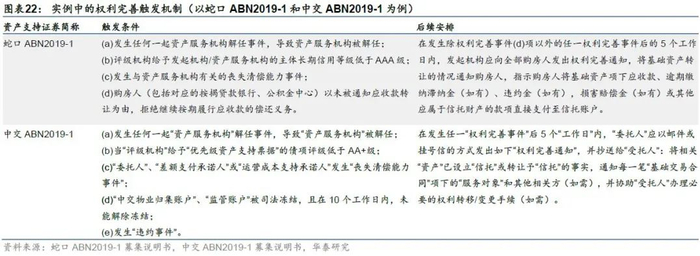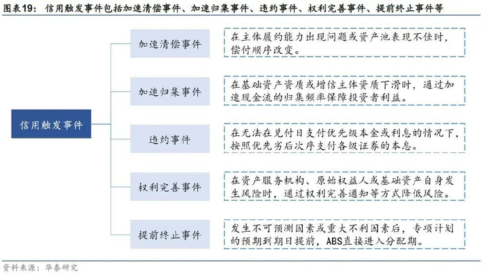 信用触发事件包括加速清偿事件、加速归集事件、违约事件、权利完善事件、提前终止事件等。信用触发机制是指当出现不利于ABS偿付的负面情况时,通过启动信用触发事件对原有现金流的归集和分配顺序进行重新安排,从而保护投资者利益的机制。信用触发机制通过对不利情况作出反应,能够在一定程度上缓释事件风险的影响。在不同的ABS中,各类事件的触发条件有所差异,常见的触发条件包括评级下调、违约率上升、早偿率较高等,某类条件的发生可能同时引起多项信用触发事件。