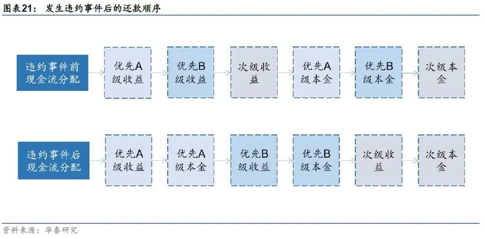 违约事件在已经影响证券的兑付时启动,按照优先劣后次序保护最高层级利益。违约事件相较于加速清偿事件更为严重,一般出现在资产池质量严重恶化、无法在兑付日支付优先级本金或利息的情况下。在发生违约事件后,不再区分本金和收入账户,而是将回收款统一支付税费、机构费用后,严格按照优先劣后次序支付各级证券的本息。与加速清偿事件仅牺牲次级收益相比,违约事件中优先B级本息的偿付劣后于优先A级,可能还会牺牲优先级中较低层级证券的利益。