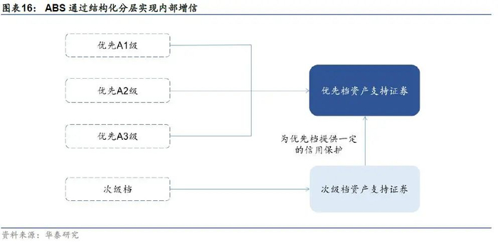 增信是降低ABS信用风险的重要手段,也是资产证券化的重要环节。其中,在基础资产池的构建过程中提升资产包质量的手段为内部增信,主要方式包括结构化分层增信、超额抵押、超额利差、设立现金储备账户、设置信用触发机制等。外部增信方式包括差额补足承诺、第三方担保、回购承诺等。