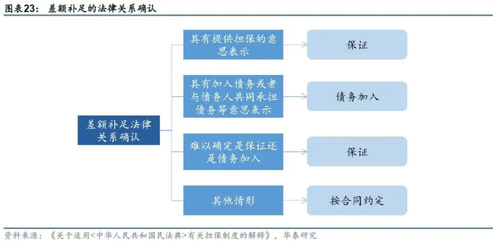 外部增信主要包括差额补足和担保,差额补足在法律关系和审批程序方面弱于保证担保。保证担保是指当债务人不履行到期债务或者发生当事人约定的情形时,保证人履行债务或者承担责任的行为。保证担保形成了清晰的三方法律关系,债权人可凭保证担保合同关系向保证人主张担保责任。而差额补足是指当融资方无法在约定期限内足额向资金提供方返还本金或收益时,由差额补足义务人就差额部分向资金提供方承担补足义务的行为。与保证担保相比,差额补足所形成的法律关系具备多种可能。根据《民法典》规定,差额补足合同内容构成保证担保的,参照保证担保处理;内容不构成保证担保但构成债务加入的,按照债务加入处理;难以确定是保证还是债务加入的,按保证处理;内容既非保证担保又非债务加入的,按照合同约定处理。此外,在签约审批程序的严格性方面,差额补足明显弱于保证担保。