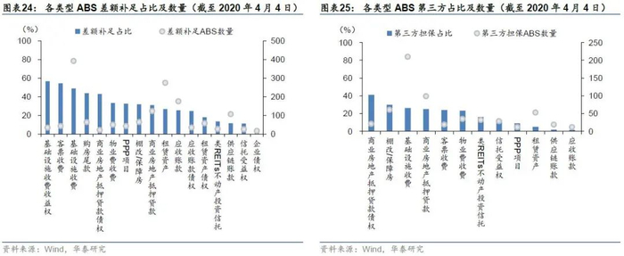 实操中,进行差额补足和第三方担保增信的以基础设施类及不动产类ABS为主。截至2020年4月4日,在整个ABS市场中,有差额补足增信的ABS占比为17.55%,有第三方担保增信的ABS占比为7.09%,差额补足较第三方担保增信更受到发行人的欢迎。具体来看,采用以上两种方式进行增信的多为基础设施类及不动产类ABS,其中基础设施类ABS有差额补足的占比约50%,有第三方担保的占比约30%;不动产类ABS有差额补足的和有第三方担保的占比均在40%左右。