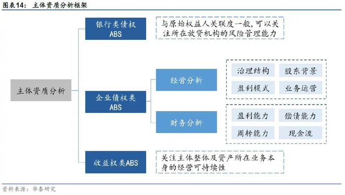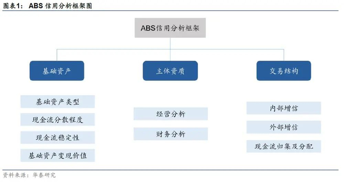 ABS的信用资质的分析可从基础资产、主体资质、交易结构三方面入手。第一,基础资产是ABS偿债的第一来源,主要考察基础资产类型、现金流分散程度、现金流稳定性和基础资产的变现价值四个维度。其中,基础资产类型影响ABS资产包的风险收益特征,现金流分散度影响风险实际分散效果,现金流的稳定性影响产品收益,基础资产变现价值是偿债的底线。第二,主体资质是影响ABS信用的重要因素,重要性受底层资产与原始权益人的关联程度和原始权益人自身增信的影响,一般对于企业债权类ABS与收益权类ABS的主体资质需重点考察。第三,交易结构影响ABS的信用增级与现金流的偿付,应关注内部、外部增信措施的风险点,并综合考虑资产池特点和交易结构安排进行现金流的测算和加压测试。
