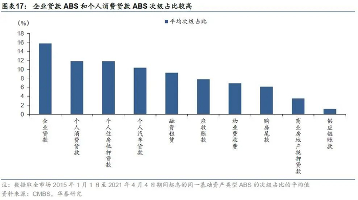 多数ABS产品划分有次级档,其中企业贷款ABS的次级占比较高。取全市场自2015年初至2021年4月4日期间起息的ABS做统计,约有86.95%的ABS划分了次级档。在所有划分次级档的ABS中,平均次级占比为7.75%。分基础资产类型来看,企业贷款ABS的平均次级占比较高,为15.75%,从而补偿企业贷款ABS底层资产质量参差不齐和集中度风险较高的问题,为优先级提供一定信用保护;个人消费贷款ABS、个人住房抵押贷款ABS和个人汽车贷款ABS的平均次级占比也均在10%以上,次级档厚度较大;而供应链账款ABS对于发行主体的准入门槛较高,具有信用资质较好大型房企背书,因此对次级保护的需求较低,在统计样本中约有38.96%的供应链ABS没有划分次级档。