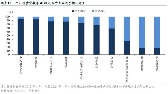 在各类ABS中,贷款类ABS的还本方式以过手摊还为主,供应链ABS更青睐固定摊还。取全市场自2015年初至2021年4月4日期间起息的ABS做统计,个人消费贷款ABS和企业贷款ABS中采用过手摊还方式发行的规模占比均在90%以上,通过过手摊还的方式提高资金利用率,在现金流多的时候及时偿还本金,避免资金闲置。而供应链账款ABS和物业费收费ABS更倾向于固定摊还,在样本数据中两类ABS采用固定摊还方式的规模占比均在80%以上,为投资者提供更稳定的现金流保障。
