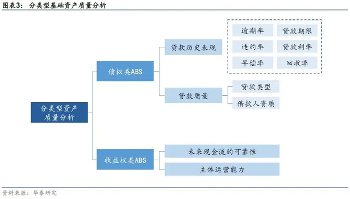 首先,基础资产的种类影响ABS资产包的风险收益特征,从而决定信用分析方法。其次,基础资产现金流的分散度影响ABS的风险分散效果,从入池资产笔数、资产关联度、最终风险来源三个维度分析。此外,现金流稳定性影响产品收益,重点对早偿和逾期情况进行分析。最后,基础资产变现价值是偿债的底线。
