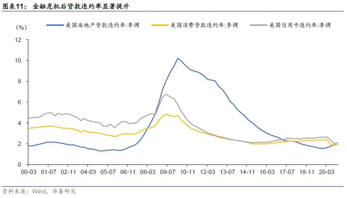 除个体因素外,金融环境影响对底层资产现金流的稳定性影响较大,特别是底层为周期性资产的ABS产品。以2008年次贷金融危机为例,在危机爆发后美国房地产贷款违约率迅速上升,从2008年初的2.9%迅速上行至2009年末的9.45%,并继续持续上行至2010年3月,季调违约率最高值达10.21%,比金融危机爆发前提升了约8个pct。消费贷款和信用卡贷款违约率也有明显上行,但上行幅度弱于房地产贷款违约率,自2008年初至2009年末,消费贷款违约率上升了1.19个pct,信用卡违约率上行了1.73个pct。因此,对于房地产贷款等对金融环境反应剧烈的资产品种,应重点分析宏观经济状况对其ABS现金流稳定性的影响。