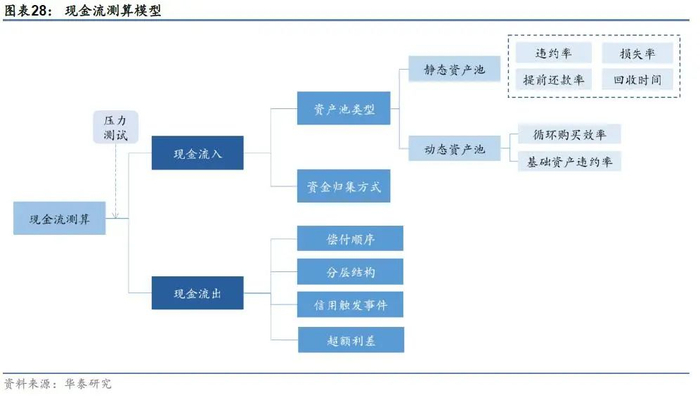 ABS产品的现金流分配对产品收益及偿债保护影响较大,对现金流的测算通常需要考虑资产池特点和交易结构安排,并进行加压测试。