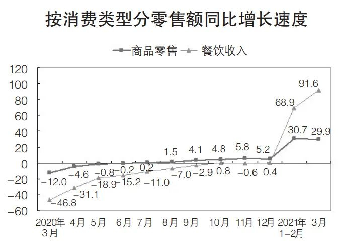 一是商品消费实现较快增长。商品零售额同比增长30.4%,比2019年同期增长近10%。尤其是汽车、家居家电都呈现较好增长势头。今年一季度,我国汽车消费潜力继续释放,新车销量648.4万辆,同比增长75.6%,比2019年同期增长1.8%;其中新能源汽车销量51.5万辆,同比增长2.8倍,比2019年同期增长72.2%;二是服务消费呈明显恢复势头,在疫情控制和就地过年的带动下,餐饮、电影票房、旅游、住宿等消费呈现快速恢复态势,前期受到疫情影响较大的消费领域正在逐渐恢复;三是线上消费等新型消费仍呈较快增长态势;四是农村消费也出现明显增长。