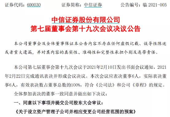 除了中信建投,今年2月22日晚间,券商“一哥”中信证券也公告,董事会同意出资不超过人民币30亿元(含)(其中初始注册资本人民币10亿元),设立全资子公司中信证券资产管理有限公司(暂定名)。同时,同意公司按照监管要求,视该子公司风险控制指标情况,为其提供累计不超过人民币70亿元(含)净资本担保承诺。