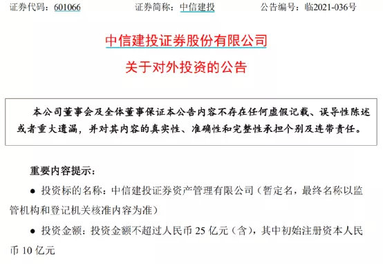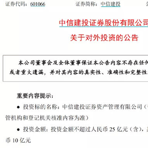 4月22日,中信建投发布关于对外投资的公告,拟出资不超过人民币25亿元设立一家全资附属的资产管理子公司,从事证券资产管理相关业务,从而推动本集团资产管理业务取得更好发展。