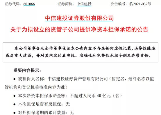 中信建投还发布了《关于为拟设立的资管子公司提供净资本担保承诺的公告》,为确保本集团资产管理业务的顺利过渡,合理配置资本,有效利用资金,公司拟在现金出资之外,根据监管要求与资管子公司风险控制指标情况,为资管子公司提供累计不超过人民币40亿元(含)的净资本担保承诺,确保资管子公司持续满足监管指标要求及业务发展需要。净资本担保承诺的有效期自资管子公司成立之日起至其资本状况能够持续满足监管机构要求时止。