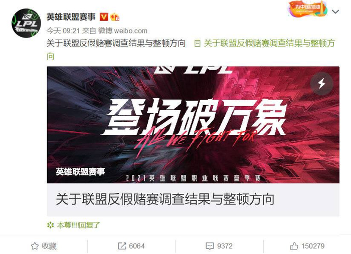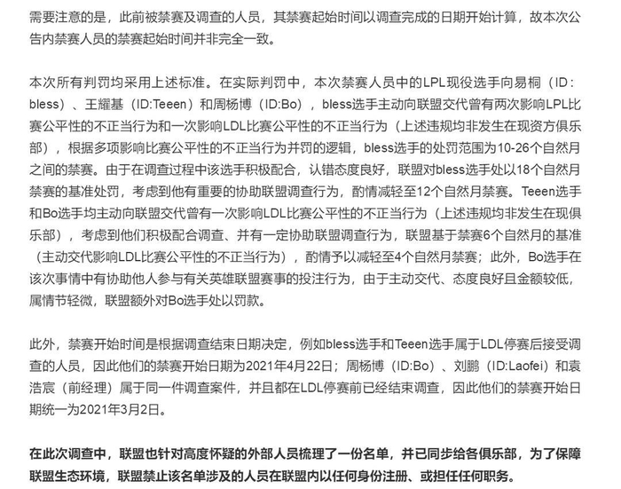 4月22日,英雄联盟职业赛事纪律管理团队发布了《关于联盟反假赌赛调查结果与整顿方向》公告,正式公布了内部调查一个多月以来的结果,其中三名LPL选手因在LDL时期参与加赛的经历被禁赛4-12个月,LDL战队SJG被取消参赛资格,另有37名选手、教练、经理被禁赛,最严重的被永久禁赛。