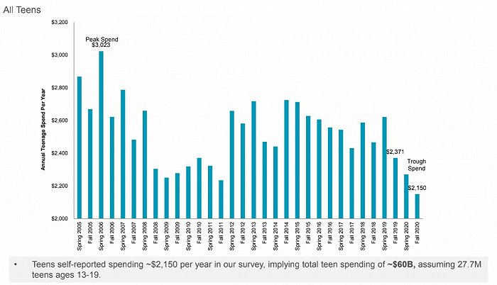 以前我们在SHEIN那篇文章里提过,美国年轻人的花销,这十年顶峰的时候也不过3023美元,请注意这是年度花销,不是每个月。所以平均下来每个月也就2000块人民币左右。