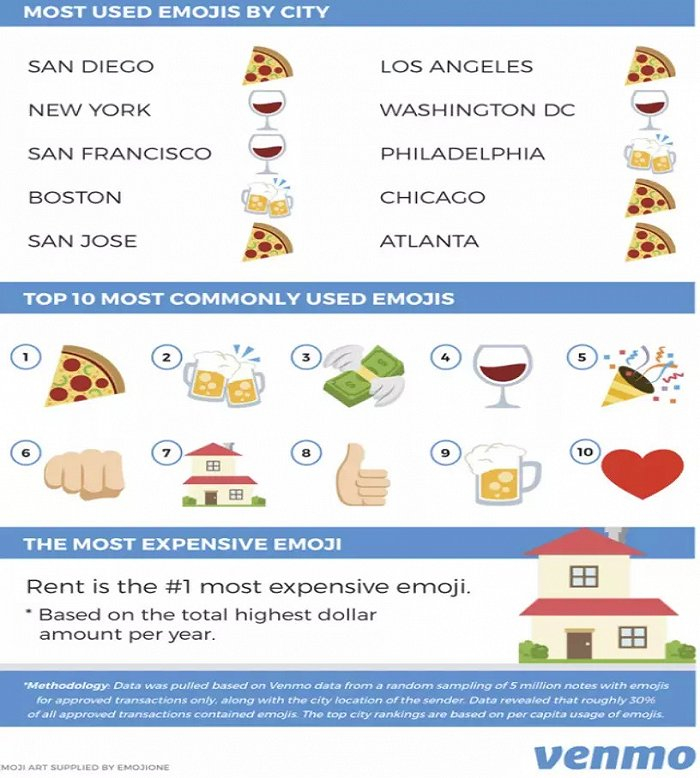 美国本土一个有趣的调查显示,因为可以加上一句话描述付钱的目的或事件,所以一些emoji表情被大量使用。