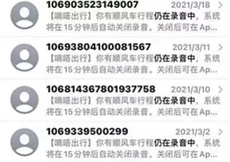 三月起,闻女士使用“嘀嗒出行”网约车平台的顺风车功能,行程结束后她多次收到短信提示“你有顺风车行程仍在录音中,系统将在15分钟后自动关闭录音”。