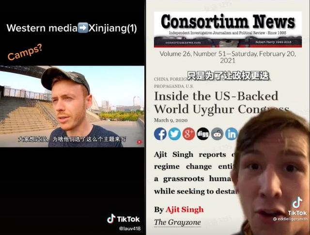 美国小哥@eddieligersmith是TikTok上时政领域当之无愧的网红。他的账号有23万粉丝和1300万的点赞。在近期发布的新疆的视频中,他表示,“永远不要相信美国以人权为借口的谎言”,并指出了美国中央情报局(CIA)和“世界维吾尔代表大会”之间说不清道不明的关系。