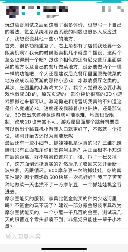 在一万多条的评论里,不少得到了测试资格的玩家都非常认真的给出了自己的评价与建议,可见玩家们都有着一颗盘活摩尔庄园的心。