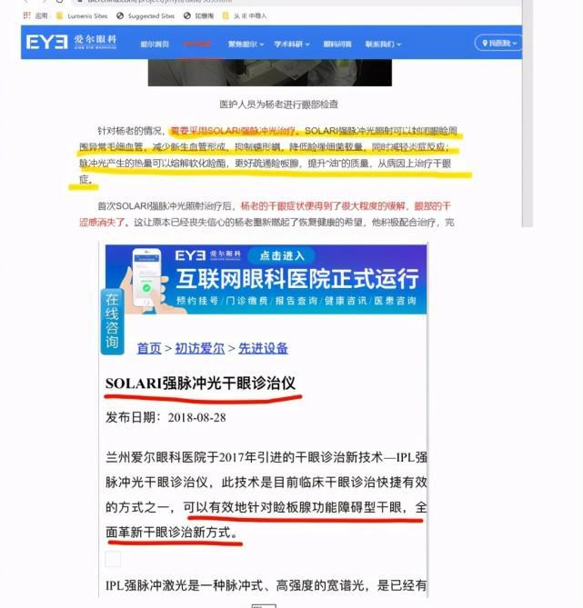 在爱尔眼科和达美康官方网页,也曾出现路创丽强脉冲光治疗仪用于治疗干眼症的宣传。