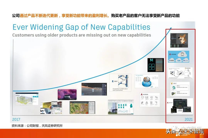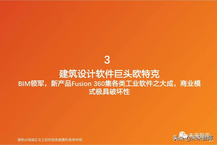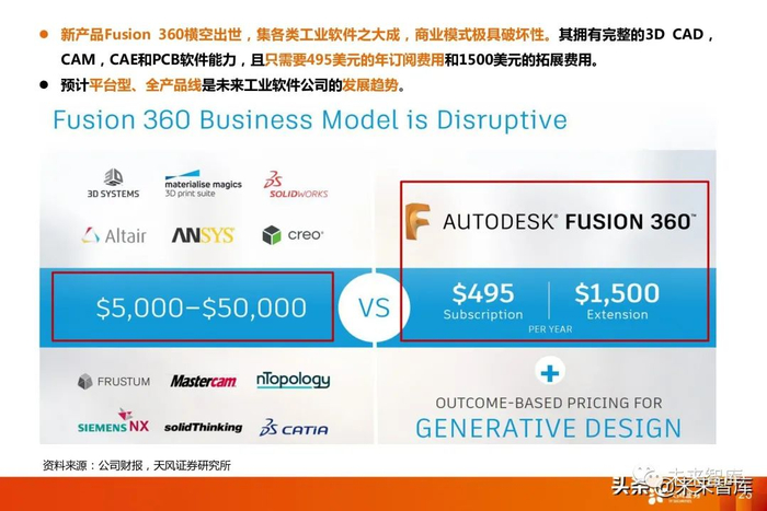 建筑设计软件巨头欧特克:符合预期,BIM领军,新产品Fusion 360集各类工业软件之大成,商业模式极具破 坏性。预计平台型、全产品线是未来工业软件公司的发展趋势。