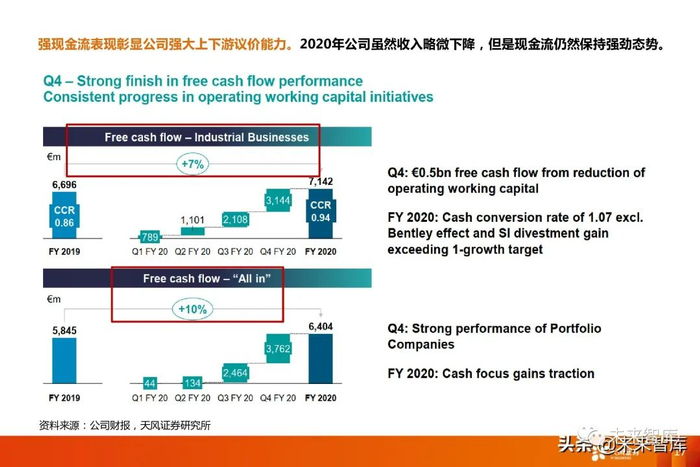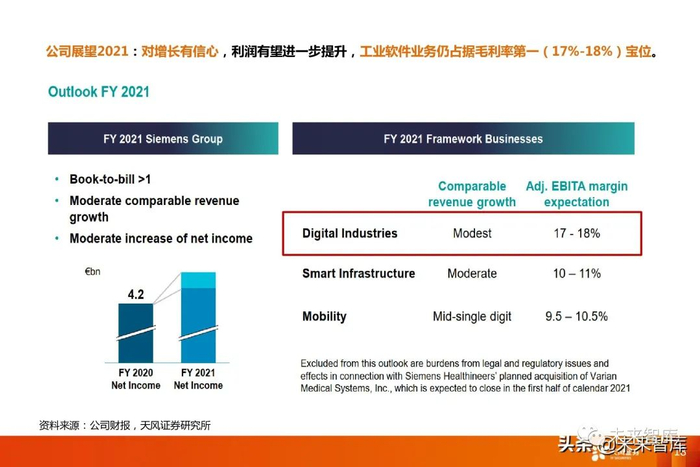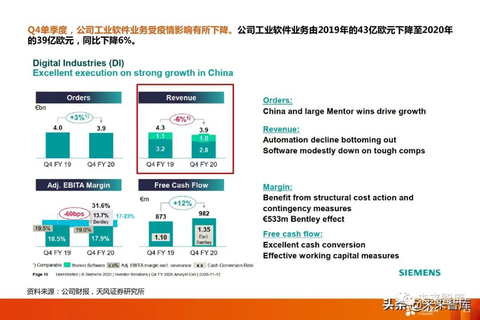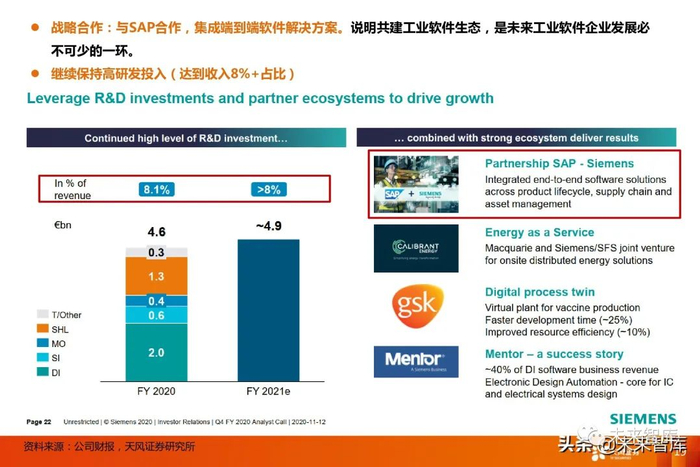 平稳度过疫情,工业软件占据高毛利率宝位,中国业务逆势上扬。西门子已经公布2020财年Q1-Q4的财务情况。从2020年全年来看,公司平稳度过疫情,收入下降2%。Q4单季度,公司工业软件业务受疫情影响有所下降。公司工业软件业务由2019年的43亿欧元下降至2020年 的39亿欧元,同比下降6%。西门子工业软件业务在中国逆势上扬,增速达14%。而其他地区都呈现下降态势。(目前中国工业软件行业高 景气,行业内公司有望获得较大发展。)强现金流表现彰显公司强大上下游议价能力。2020年公司虽然收入略微下降,但是现金流仍然保持强劲态势。公司展望2021:对增长有信心,利润有望进一步提升,工业软件业务仍占据毛利率第一(17%-18%)宝位。战略合作:与SAP合作,集成端到端软件解决方案。说明共建工业软件生态,是未来工业软件企业发展必 不可少的一环。继续保持高研发投入(达到收入8%+占比)。