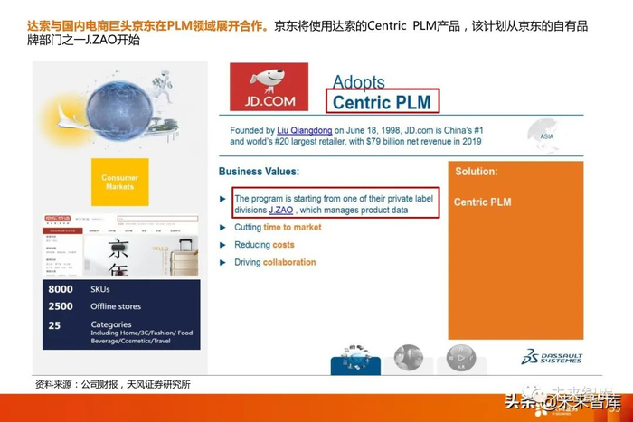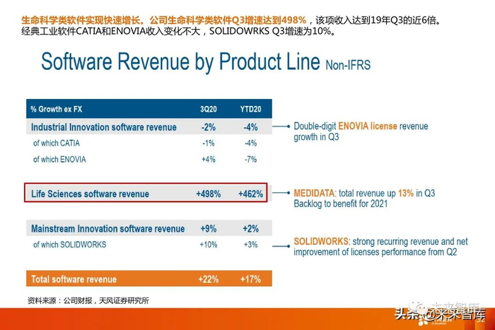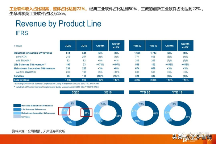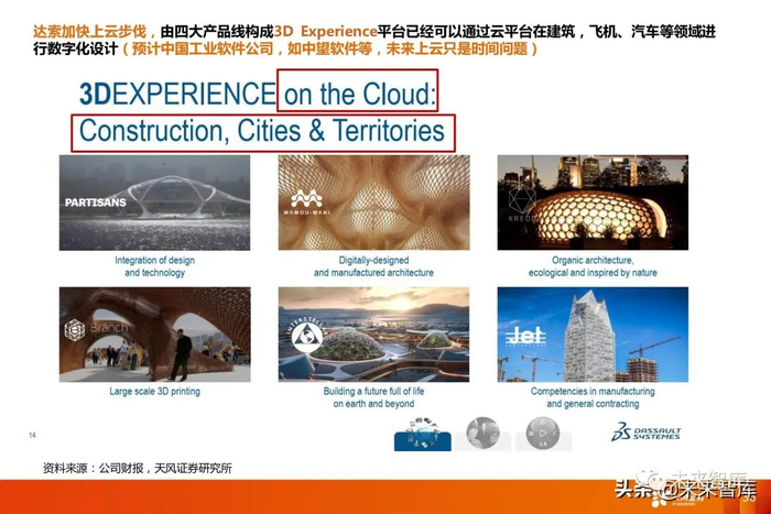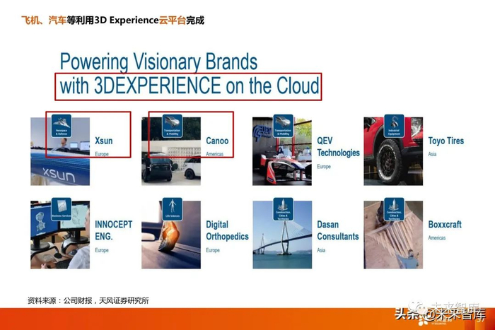软件业务双位数增长,产品云化成为趋势,与京东建立PLM合作。达索Q3季度整体表现亮眼,软件业务保持双位数增长(17%),占总收入91%。其中,软件订阅收入同比 增长28%,占软件收入82%。工业软件云化后抗风险能力增强被验证。生命科学类软件实现快速增长。公司生命科学类软件Q3增速达到498%,该项收入达到19年Q3的近6倍。经典工业软件CATIA和ENOVIA收入变化不大,SOLIDOWRKS Q3增速为10%。工业软件收入占比很高,整体占比达到72%。经典工业软件占比达到50%,主流的创新工业软件占比达到22%, 生命科学类工业软件占比为18%。中国地区景气度高,保持双位数以上的增长领先亚洲;美国是收入增速(46%)与占比(38%)均保持最高的地区, 但主要是由于生命科学类软件的快速增长,与工业软件无关。达索与国内电商巨头京东在PLM领域展开合作。京东将使用达索的Centric PLM产品,该计划从京东的自有品 牌部门之一J.ZAO开始。达索加快上云步伐,由四大产品线构成3D Experience平台已经可以通过云平台在建筑,飞机、汽车等领域进 行数字化设计(预计中国工业软件公司,如中望软件等,未来上云只是时间问题)飞机、汽车等利用3D Experience云平台完成。