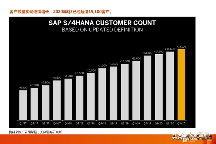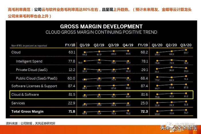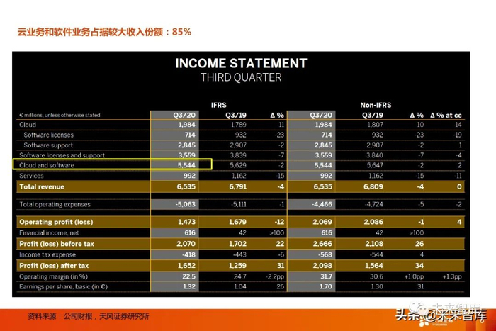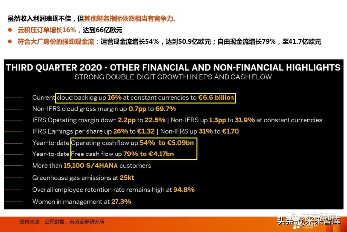 云业务逆势上涨,重要性不断提升,高毛利率典范。Q3总收入、利润呈下降态势,云业务保持双位数增长(11%)。虽然收入利润表现不佳,但其他财务指标依然相当有竞争力。云积压订单增长16%,达到66亿欧元。符合大厂身份的强劲现金流:运营现金流增长54%,达到50.9亿欧元;自由现金流增长79%,至41.7亿欧元。云业务和软件业务占据较大收入份额:85%。云业务一览:云应用程序订阅者数量达到了2.3亿。亚太国家中,中国不是公司云收入的强力贡献地区,可见公司云业务受金蝶、用友等云计算领军企业竞争压力较 大。高毛利率典范:公司云与软件业务毛利率高达80%左右,且呈现上升趋势。(预计未来用友、金蝶等云计算龙头 公司未来毛利率也会上升)。客户数量实现连续增长,2020年Q3已经超过15,100客户。
