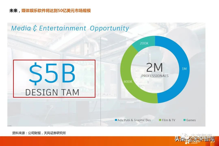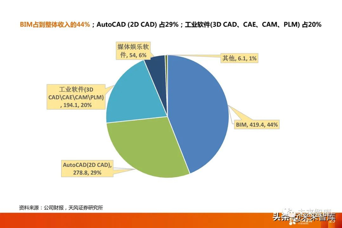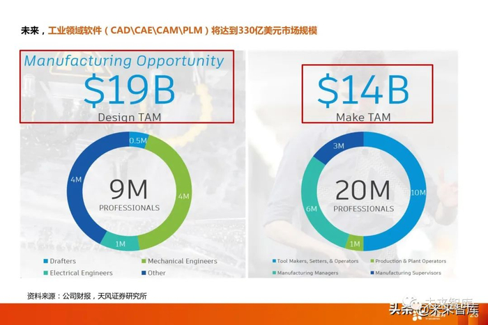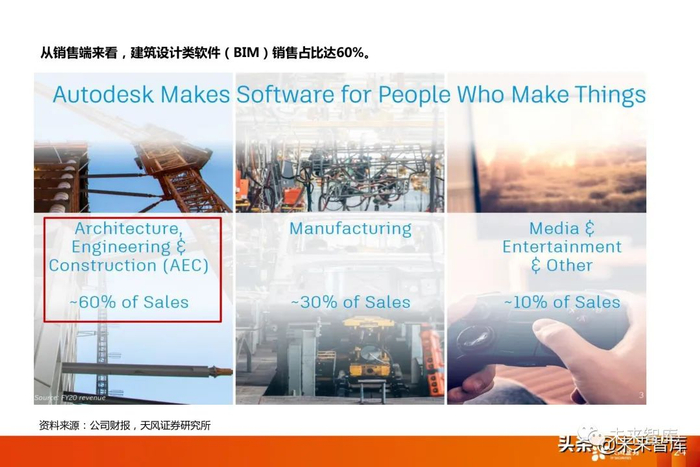BIM领军,新产品Fusion 360集各类工业软件之大成,商业模 式极具破坏性。收入实现双位数增长。公司Q3单季度实现14.6%的增长,总收入达到9.52亿美元。公司作为建筑设计领域龙头,BIM软件仍然贡献收入较大部分,收入为4.19亿美元。BIM占到整体收入的44%;AutoCAD (2D CAD) 占29%;工业软件(3D CAD、CAE、CAM、PLM) 占20%。从销售端来看,建筑设计类软件(BIM)销售占比达60%。公司通过产品不断迭代更新,享受新功能带来的盈利增长。购买老产品的客户无法享受新产品的功能。新产品Fusion 360横空出世,集各类工业软件之大成,商业模式极具破坏性。其拥有完整的3D CAD, CAM,CAE和PCB软件能力,且只需要495美元的年订阅费用和1500美元的拓展费用。预计平台型、全产品线是未来工业软件公司的发展趋势。行业高景气,广阔市场空间为公司未来增长背书。公司预计,未来,建筑设计领域软件(BIM)将达到310亿美 元市场规模(可以看到中国市场很大)。未来,工业领域软件(CAD\CAE\CAM\PLM)将达到330亿美元市场规模。未来,媒体娱乐软件将达到50亿美元市场规模。