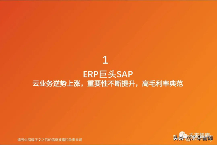 ERP巨头SAP:符合预期,云业务逆势上涨,云与软件业务重要性不断提升(占比85%),高毛利率典范;公 司中国地区业务在与国内云计算、ERP龙头企业用友、金蝶等的竞争中占下风。预计国内相关公司毛利率未来 也会提升。