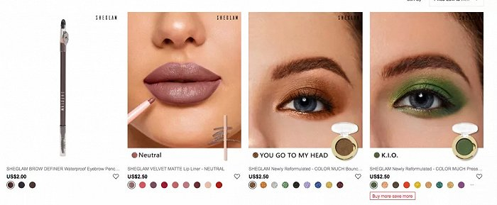 在2020年结束前,Shein甚至进军了美妆行业,开发了美妆品牌Sheglam。2美金的口红,2.5美金的眼影让海外年轻人感受到消费降级的同时,也让针对学生党的海外美妆品牌感受到压力。