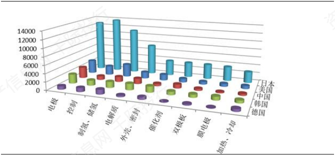 总体上看,日本、美国、中国、韩国和德国是燃料电池技术主要专利申请国,各关键技术发展比较均衡。日本作为全球专利排名第一的国家,在多个关键技术上均处于绝对领先地位,技术最为全面且没有明显的短板,且控制技术方面的领先优势最为明显。美国和韩国各关键技术发展比较均衡。中国比较重视电极和催化剂的研发,德国比较关注制氢、储氢以及燃料电池加热、冷却技术。