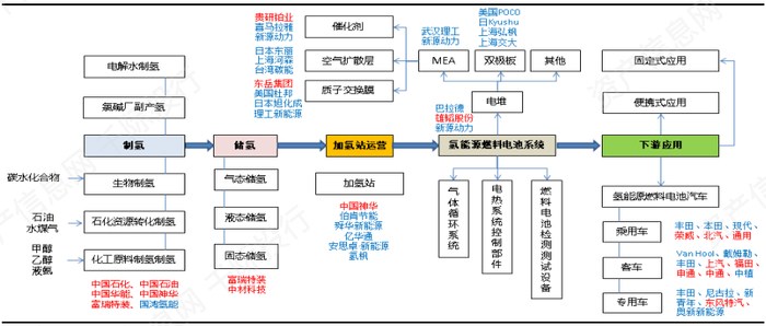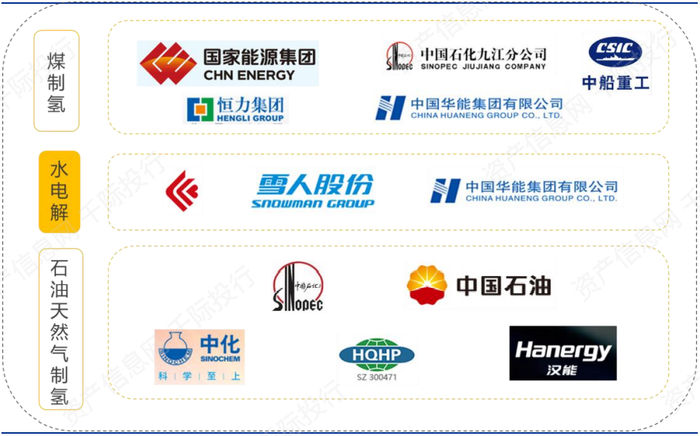 中国主要企业有中国石化[600028.SH]、上汽集团[600104.SH]、三环集团[300408.SZ]、卫星石化[002648.SZ]、美锦能源[000723.SZ]、福田汽车[600166.SH]、长盈精密[300115.SZ]、东华能源[002221.SZ]、金能科技[603113.SH]、嘉化能源[600273.SH]、汉钟精机[002158.SZ]、鸿达兴业[002002.SZ]、大洋电机[002249.SZ]、滨化股份[601678.SH]、中国石油化工股份[0386.HK]、中国石油股份[0857.HK]、联合能源集团[0467.HK]、久泰邦达能源[2798.HK]、上海石油化工股份[0338.HK]、IDG能源投资[0650.HK]、巨正源[831200.OC]、诺威尔[838732.OC]、德石股份[872731.OC]、伯肯节能[833077.OC]、美合科技[834412.OC]等。