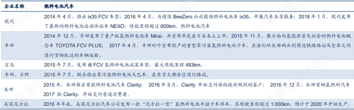 表 国外燃料电池汽车企业及其燃料电池汽车