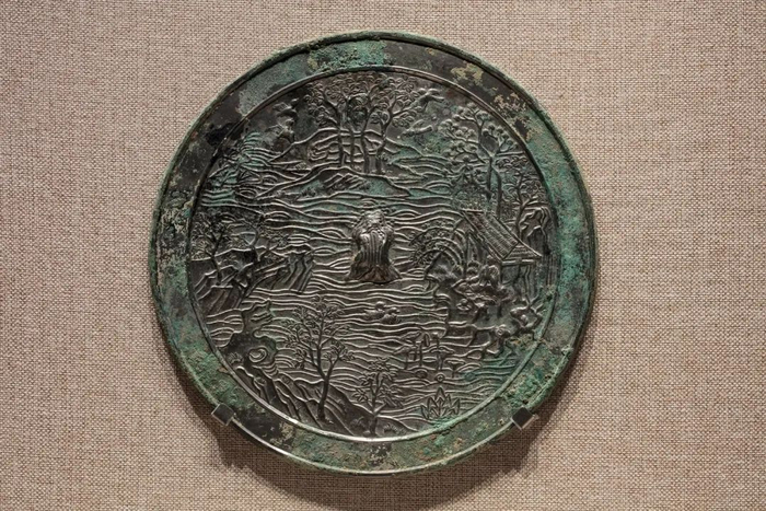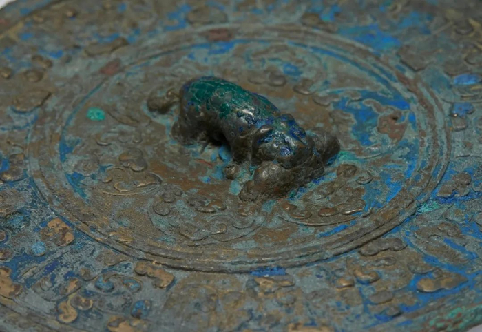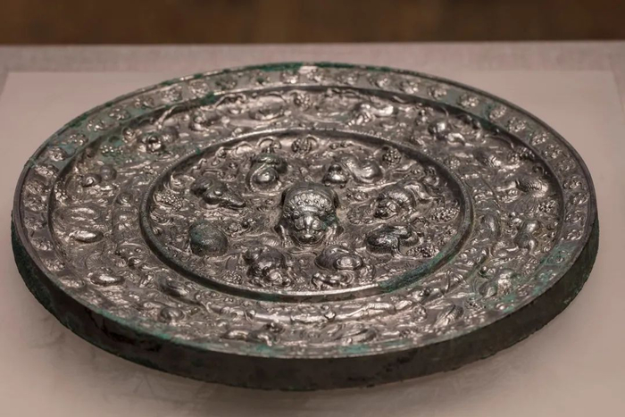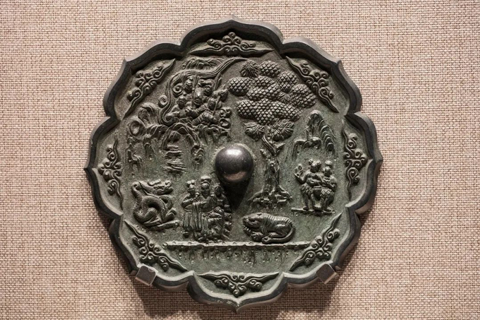 随着与中亚、南亚地区日益频繁的文化交流,带有异域元素的纹饰开始出现在北朝末期的铜镜上,东汉魏晋南北朝时期流行的神兽纹,逐渐演变成了瑞兽纹,随着高宗、武周时期西方葡萄纹饰的流行,最终发展为唐代负有盛名的瑞兽葡萄纹镜。初唐后期到盛唐,特别是在开元盛世,是各种龙纹镜、花鸟禽兽纹镜、瑞花纹镜和宗教题材镜大盛的时期,同时,极富画面感的人物和山水形象也成为铜镜纹饰的重要表现形式,更有螺钿、金银平脱、金壳银壳、镶嵌宝石等特种工艺镜,从而迎来中国历史上铜镜文化和艺术的极度繁盛期。