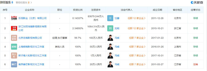 冯绍峰本命为冯威,根据天眼查,冯绍峰担任法人代表的公司有5家,担任股东的公司则有7家,其中包括持股0.14%的乐视影业。由于持股数量较少,冯绍峰并未出现在乐视影业的前50位股东名单中。有趣的是,冯绍峰的前女友倪妮旗下工作室也通过资管公司持股乐视,但具体持股数量未对外公布。